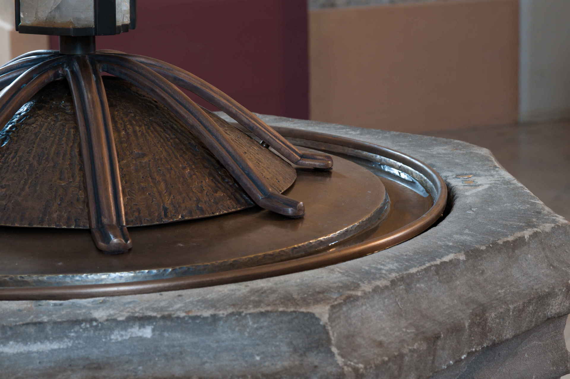 Die Weihwasserbecken wurden in Holz Stelen eingearbeitet. Sie sind aus Messing, bronzefarben brüniert. Die Schalen sind eingehängt und können zur Reinigung entnommen werden.